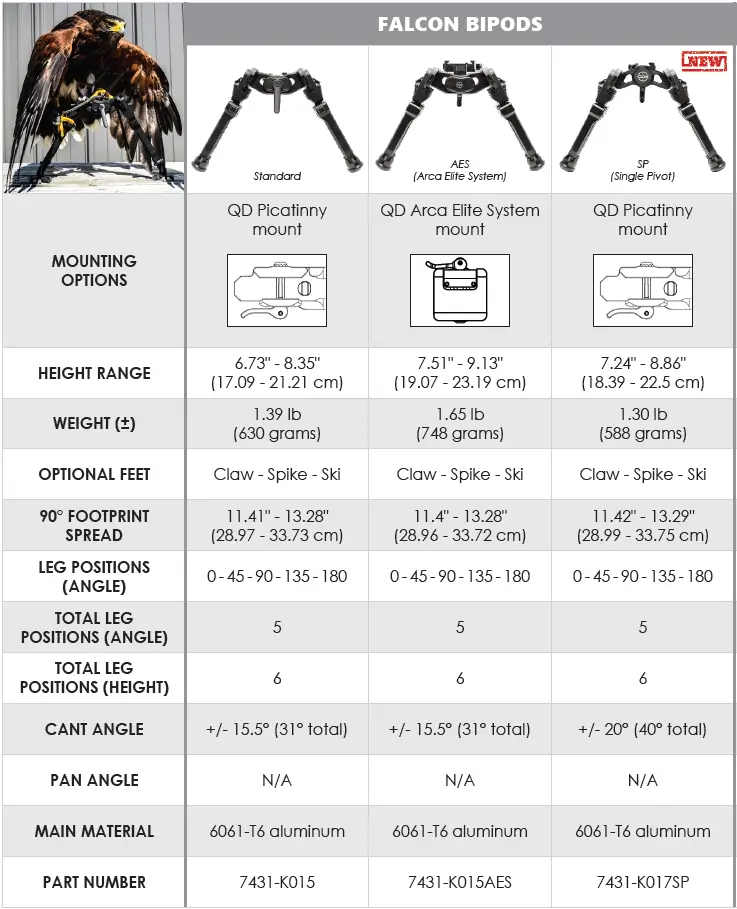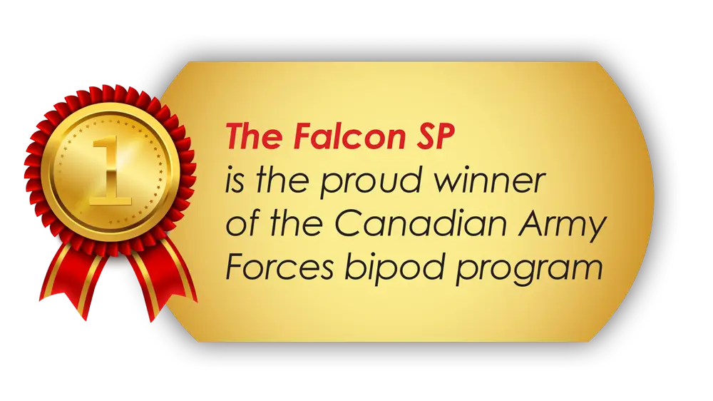 Les Bipieds Falcon ont été conçus pour offrir une stabilité optimale. Deux modèles sont disponibles, avec variantes de montage sur rail Picatinny ou AES (ARCA). Ils disposent de multiples accessoires modulaires à changement rapide, tels que pointes, griffes ou pieds skis. Un kit optionnel de rallonge de pieds est également disponible pour le tir ELR, lorsque les tireurs visent des cibles au-delà de 3 km et nécessitent une grande élévation du bipied sans compromettre la stabilité de la carabine.