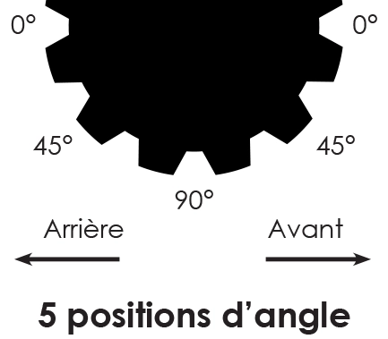 Angle d'inclinaison +/- 15° (30° au total) Angle panoramique +/- 15° (30° au total) - Se replie / se déploie vers l’avant, vers l’arrière à 45° ou en position standard à 90°.