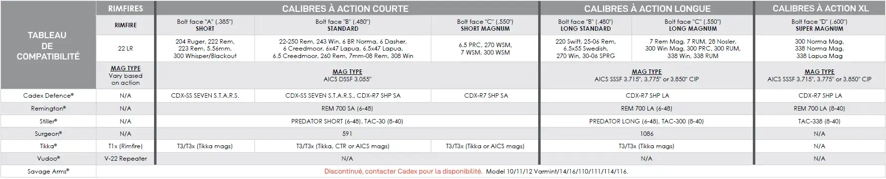 Pour toute action Defiance Machine® ou clone personnalisé Rem 700, contactez Cadex afin de valider la compatibilité avant de passer votre commande.