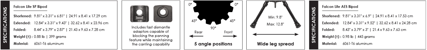 Although lighter (only 400–450 grams), the Falcon Lite Bipods maintain the same canting capability as the larger Falcon models. You benefit from full functionality without adding unnecessary weight.