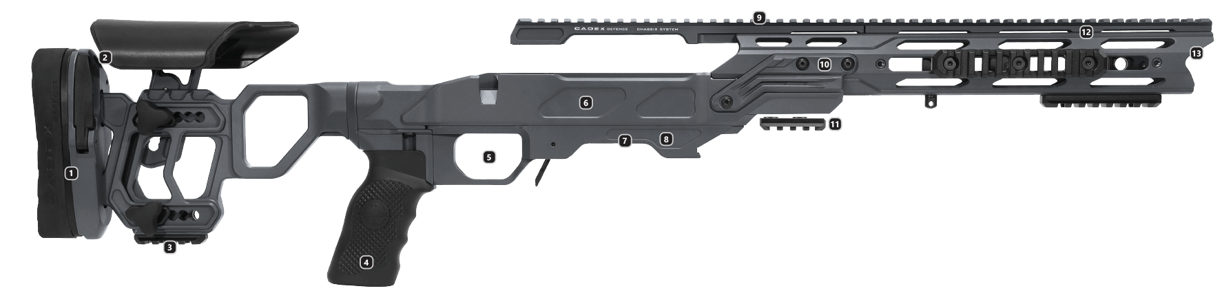 - Finger-grooved Cadex rubberized grip.