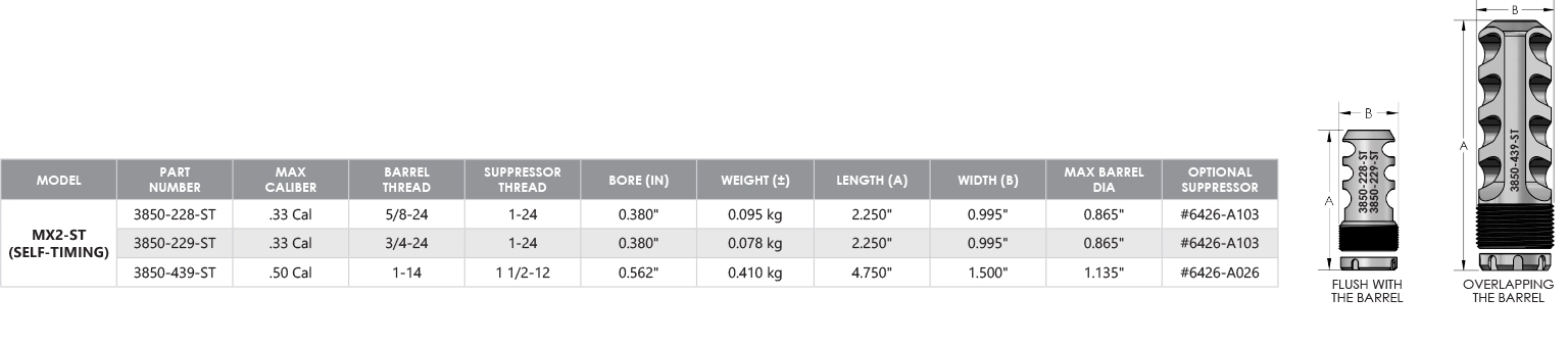 The MX2‑ST 50BMG Tactical Muzzle Brake belongs to this same family, specifically built to integrate with the Compact 50BMG Suppressor. Its self-timing lock nut design prevents unwanted rotation and lets you precisely align the suppressor on the barrel—tool included.