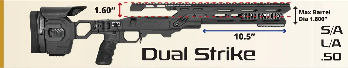 Ultimate chassis system currently in use worldwide by Special Forces units and long range shooters. This is the most stable and ruggedized chassis system on the market. The Dual Strike chassis is built from aluminum billets to avoid any weakness commonly found in cheaper products using aluminum castings. It is the chassis model that holds the record for the longest sniper kill ever reported and the one against all other chassis are measured.