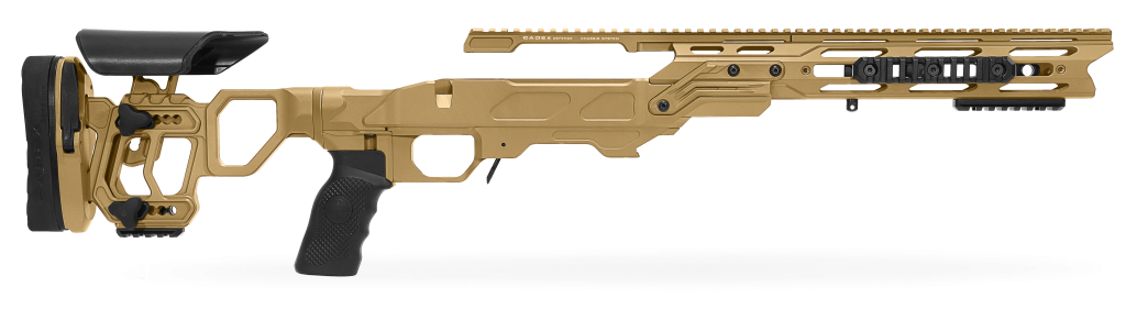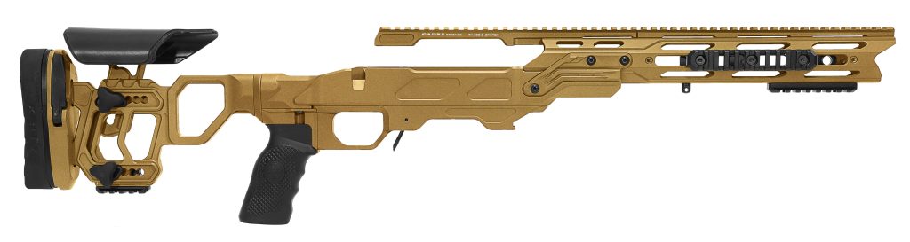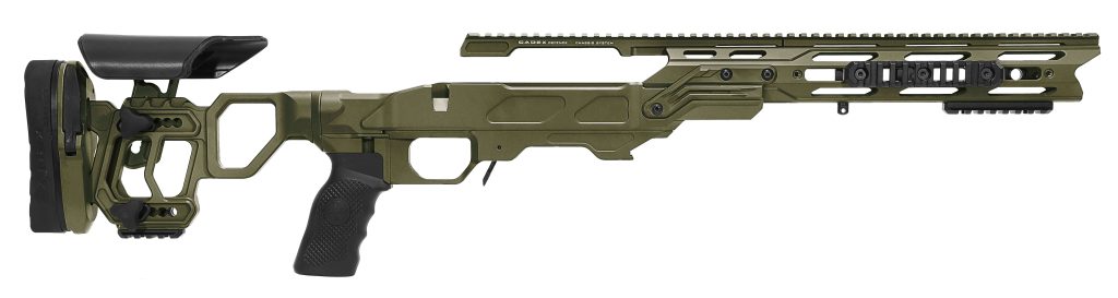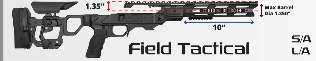 The Field Tactical is a top choice for Law Enforcement units requiring a chassis system with full rail capability at a decent price point. It features a full-length 20 MOA top rail and accessory rails at 3, 6 and 9 o’clock. The Field Tactical uses a fixed stock which makes it more budget-friendly.