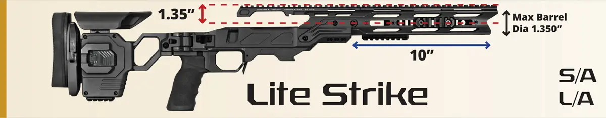 The Lite Strike is the refinement of our Dual Strike flagship model. It is the same chassis system but with emphasis on weight reduction. The Lite Strike is exactly 1 pound lighter than its predecessor and features a smaller contour fore-end tube with the same rail capabilities. Its versatility makes it very popular among worldwide special forces units as it suits perfectly the various models of 7.62×51 and 338 Lapua Mag sniper rifles they deploy with.