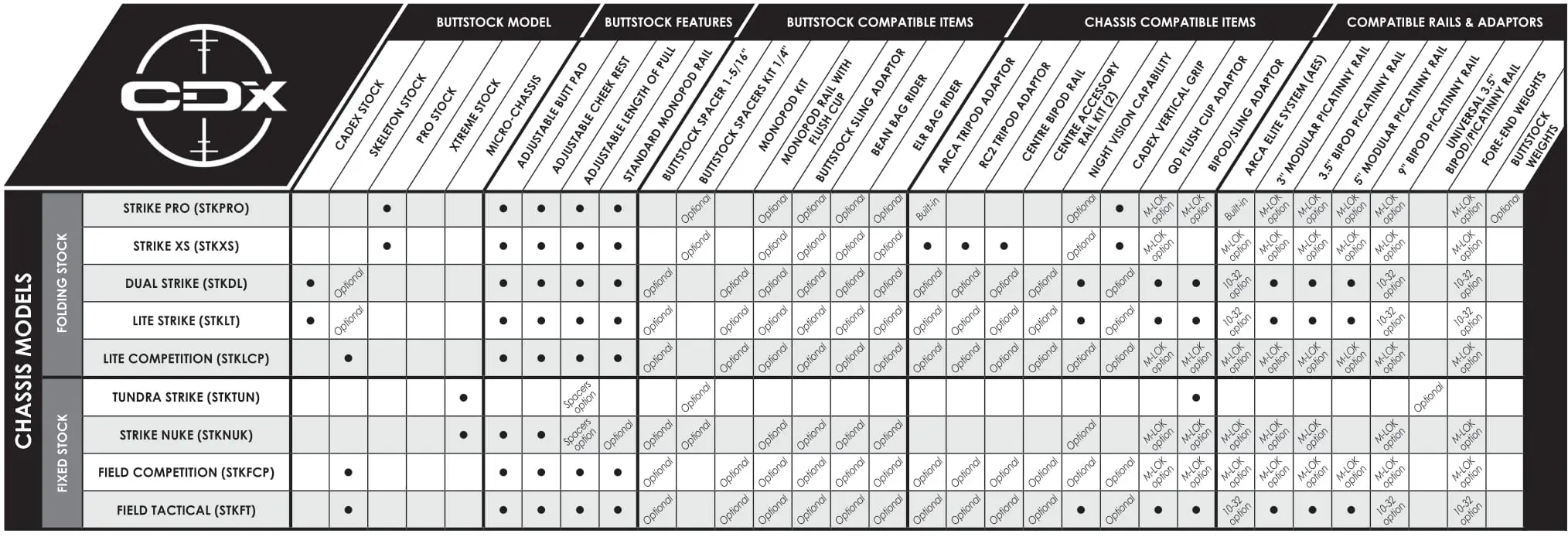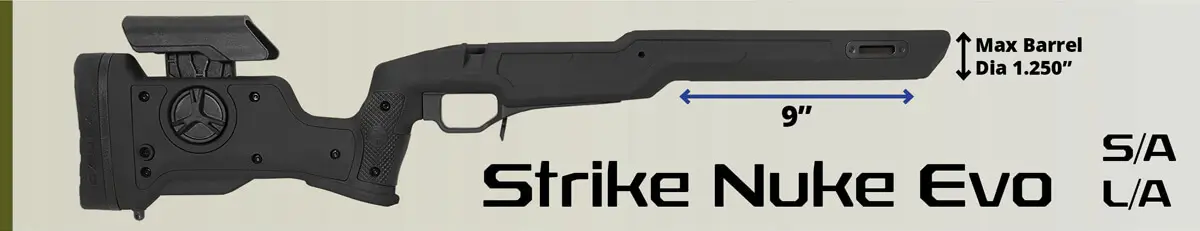 The Cadex Strike Nuke Evo micro-chassis system is designed for shooters looking for traditional stock ergonomics while benefiting from the advantages of a chassis system. Gen2 improved design with M-LOK technology and high density fiberglass reinforced polymer. The Strike Nuke Evo stock fits the CDX-SS SEVEN S.T.A.R.S., the CDX-R7 Series actions, most Rem 700 custom action clones and some Tikka® models.