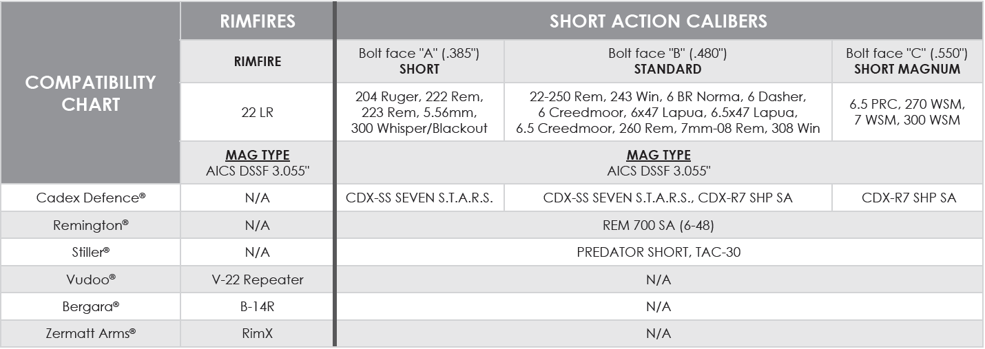 - Fits the Cadex CDX-SS SEVEN S.T.A.R.S., CDX-R7 series, all Rem 700 and most custom clone actions. Only available in short action calibers.