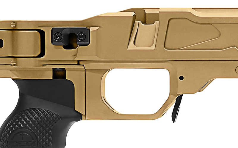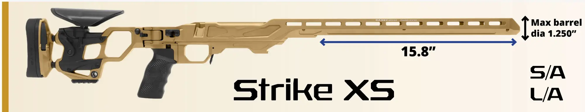 The STRIKE XS is the latest evolution of our long-range chassis systems. It incorporates most features requested by positional shooting competitors without sacrificing any features an operator needs during field operations. This chassis is built from a one-piece lower receiver and fore-end tube carved out of a solid aluminum billet. The fore-end tube features 11 side and 9 bottom M-LOK slots, was lengthened to 15.5″ and was reinforced at critical areas making it our most rigid chassis yet. An optional extra-long NVD bridge is available for a perfect alignment of thermal imaging, night vision devices, Nightforce® prism or “ballistic periscopes” such as the Charlie Tarac®. This chassis is also equipped with our PRO tool-free fully adjustable and foldable buttstock. If you are looking for a chassis capable of doing all types of shooting, such as prone, tripod or even building roof top, the STRIKE XS will fulfill your needs.