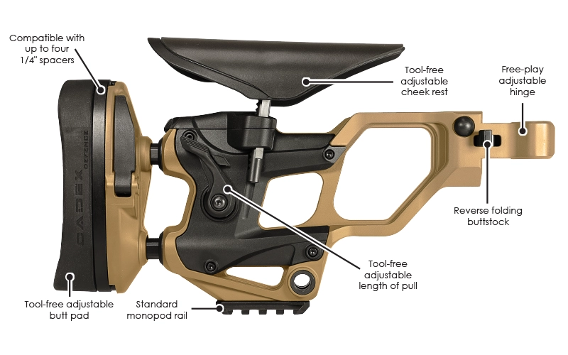 - Rock solid reverse folding stock mechanism with free-play adjustable hinge system to remove loosening that may develop over time.