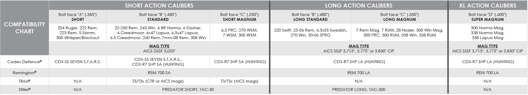 - AICS magazine type: – Short Action: DSSF 3.055″ – Long Action: SSSF 3.715″, 3775″ and 3.850″ CIP