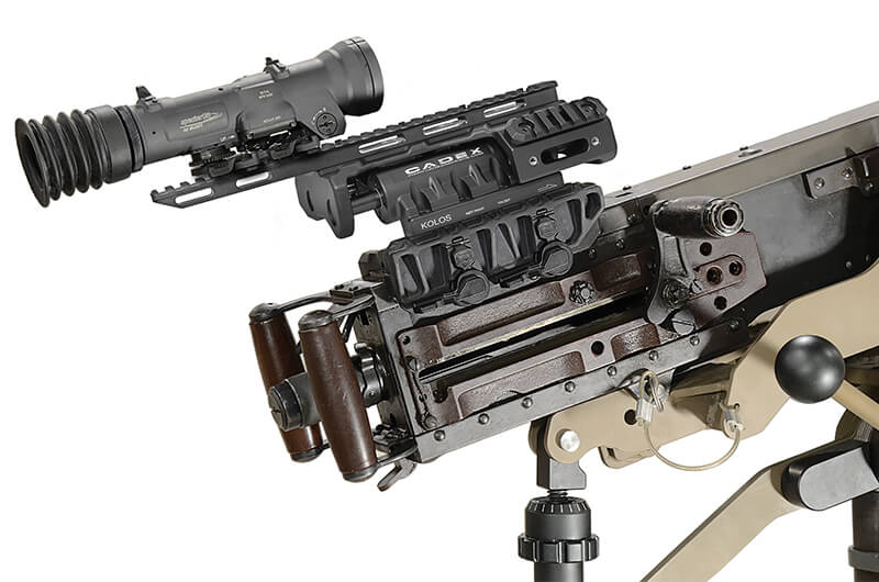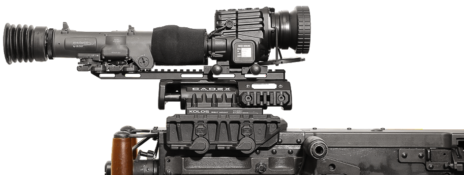 The KOLOS sight mount significantly enhances day and night fighting capabilities of the M2 .50 caliber machine gun and 40mm GMG. With the KOLOS mount, the gunner is able to rapidly transition from active to passive target acquisition methods to produce maximum effective fire on the target.