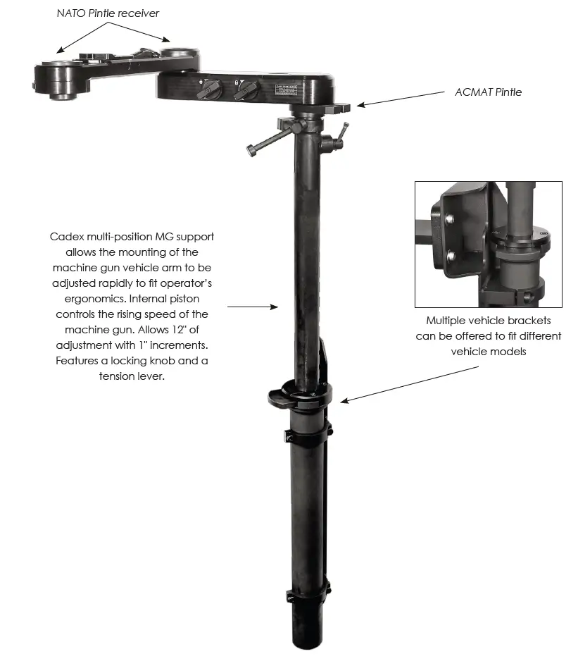 The Cadex MG vehicle arm attaches to the multi-position MG support using its ACMAT pintle. It allows the mounting of a machine gun at two different locations, either at the end of the arm or at its center section using the NATO pintle. A fast release system is used to lock/unlock the MG pintle instead of the traditional push pin. Two tension adjustment knobs are used to restrain free movement of the machine gun depending on its weight.