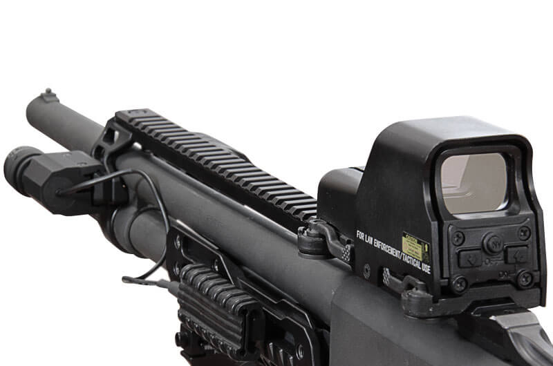 - The Mil-Std M1913 top rail permits the mounting of red dot sights so the shooter can engage targets quickly and accurately.