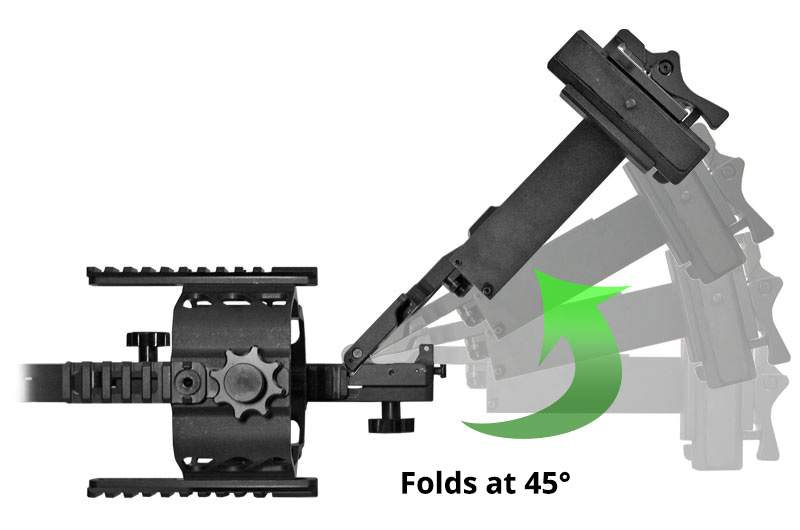 Our unique spotting scope cradle mount ensures that the spotting scope is kept parallel with the chassis and other mounted accessories. It also allows the scope to float within the inverter as it is the scope’s only point of attachment. The 6061-T6 aluminum cage on the scope inverter is lightweight. It is also equipped with Picatinny rails for a broad range of parallel accessory mounting options.