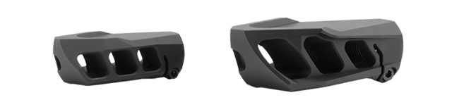 The Cadex MX1 muzzle brake is designed to deflect the muzzle blast away from the shooter and his spotter. Gases exit sideways and upwards to reduce felt recoil and improve rifle control. Multiple bore sizes are available from .223 cal to 50 BMG.