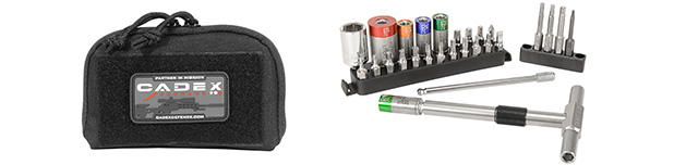 Field tooling kit with torque limiters and a variety of driving bits adapted to Cadex rifles and chassis. Comes in a compact molle webbing pouch for easy carry.