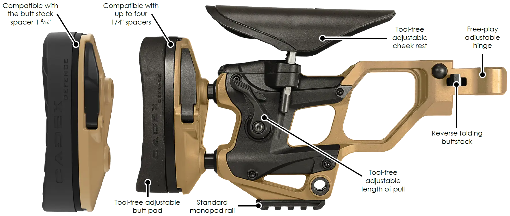 The Cadex PRO buttstock is the latest addition to our line-up of tool-free adjustable buttstocks designed for our rifles and chassis systems. It allows the shooter to rapidly adjust the length of pull, cheek riser height and butt plate positioning without any tools. The dimension of the buttstock has been slightly reduced and unnecessary weight has been removed. It also features our battle-proven reverse folding stock mechanism and its free-play adjustable hinge system which uses an off-set cam to prevent loosening that may develop over time. The PRO buttstock is compatible with all Cadex rifles* and chassis equipped with a folding hinge and is offered in two variants depending on the action model.