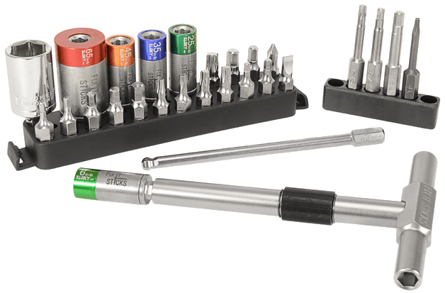 Field tooling kit with torque limiters and a variety of driving bits adapted to Cadex rifles* and chassis. Comes in a compact molle webbing pouch for easy carry. Velcro patch included**.